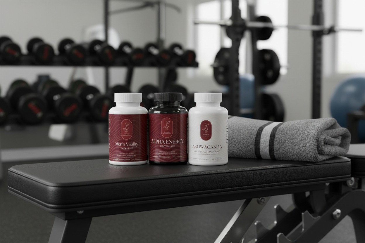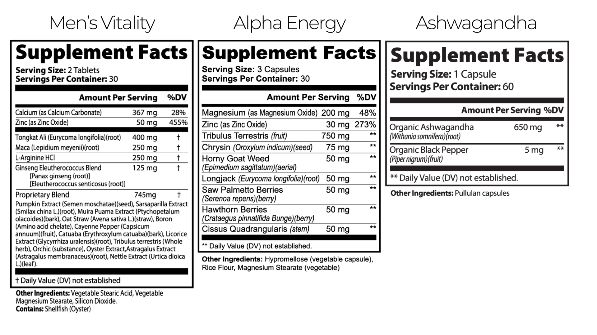 For peak results, take one serving of Men’s Vitality and Alpha Energy with your morning meal. Take one serving of Ashwagandha in the evening to support recovery and stress management.